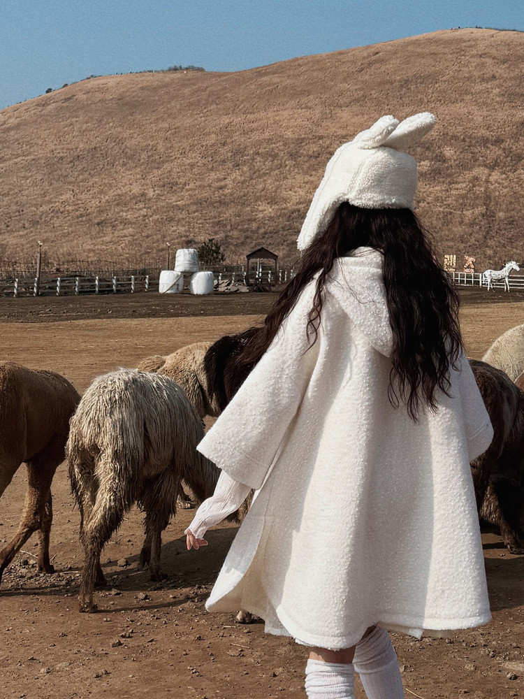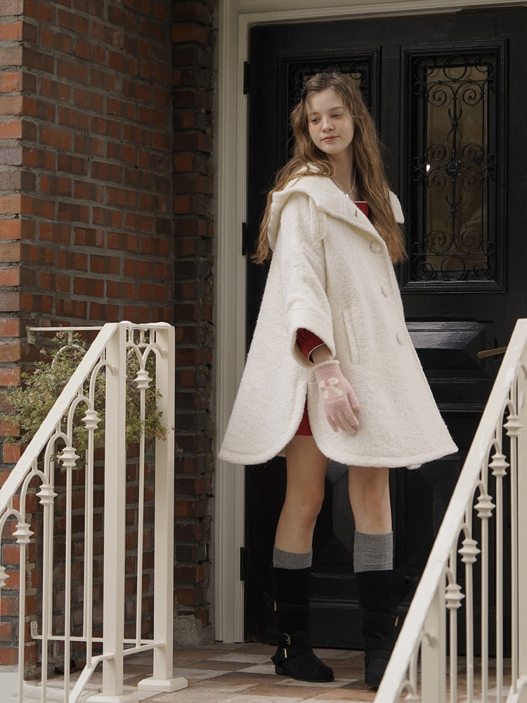 눈이 내리는 듯한 사랑스러운 조직의 울코트입니다. 전체적으로 여유 있는 A라인 실루엣으로 겨울에 도톰한 이너와 함께 착용할 때 불편하지 않도록 망토에서 착안한 디자인입니다.