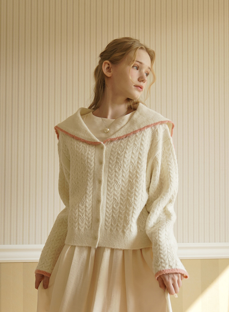 휘핑크림을 올려놓은 듯 사랑스러운 조직감과 배색 포인트, 부드러운 터치감으로 스윗한 무드를 연출하기 좋은 가디건입니다. 크롭된 기장으로 발랄하고, 세일러 카라에 스캘럽 모양으로 위트를 더했습니다. 손등을 덮는 긴 소매는 더욱 페미닌한 무드를 내며, 전체적으로 여유 있는 핏으로 다양하게 매치하기 좋습니다. (모델 착용컷의 단추는 샘플이며, 크림색 단추로 교체하였습니다.)