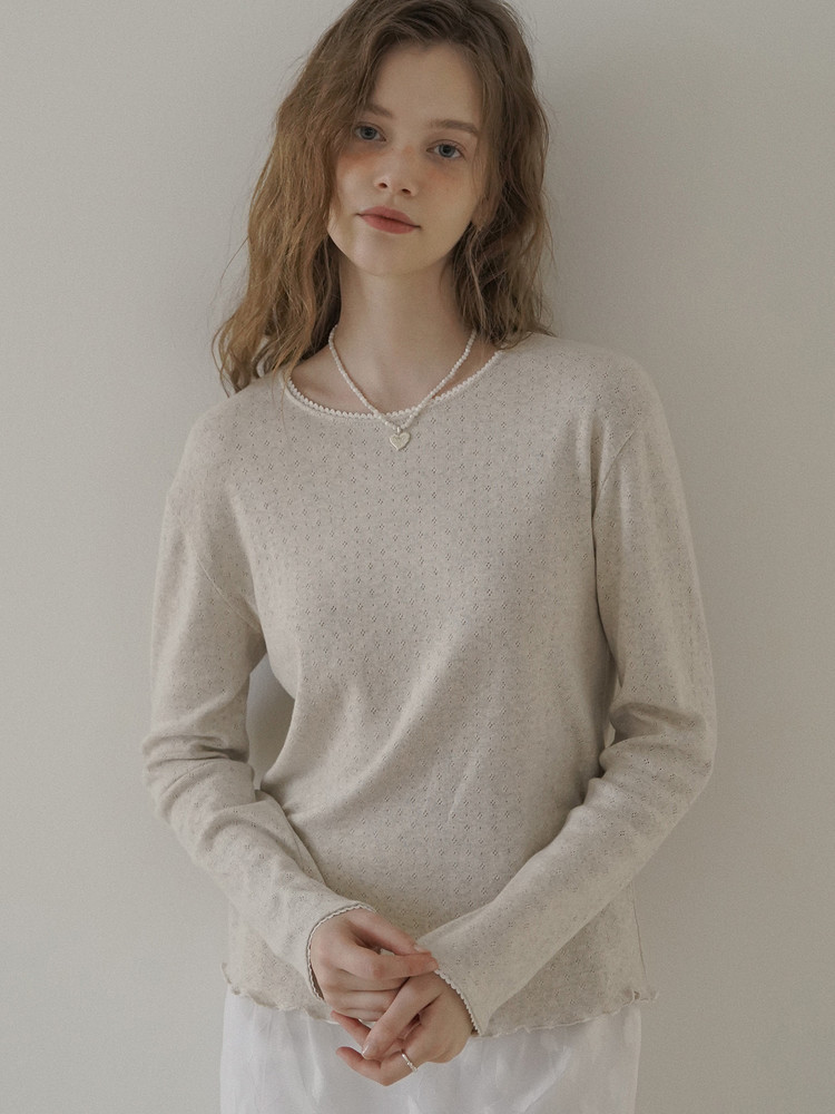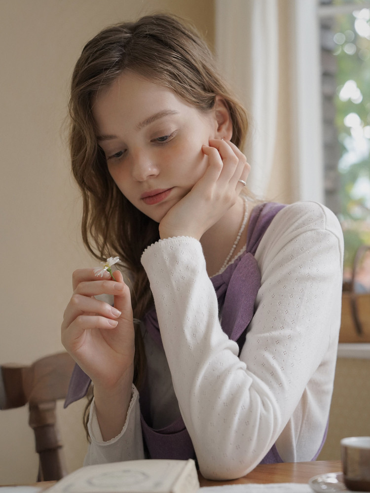 다가오는 계절에 입기 좋은 톡톡한 두께감과 펀칭 디테일의 사랑스러운 아일렛 원단이 매력적입니다. 넥라인과 소매 끝은 레이스 트리밍으로 스윗한 포인트를 더했습니다. 여유 있는 기본 핏으로 다양한 체형에 잘 어울리고, 편안하게 착용됩니다.
