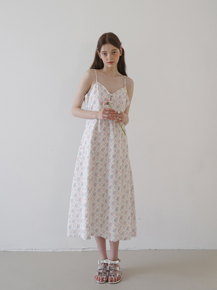 사랑스러운 플라워 패턴의 코튼 소재가 가볍고 부드럽게 몸에 감깁니다. 60수 아사면으로 안감을 넣어 가볍고, 비침 걱정 없이 착용할 수 있습니다. 아일렛 레이스업 디자인이 매력적이며, 전면 세로 절개를 낸 구조적인 실루엣으로 몸을 보정합니다.