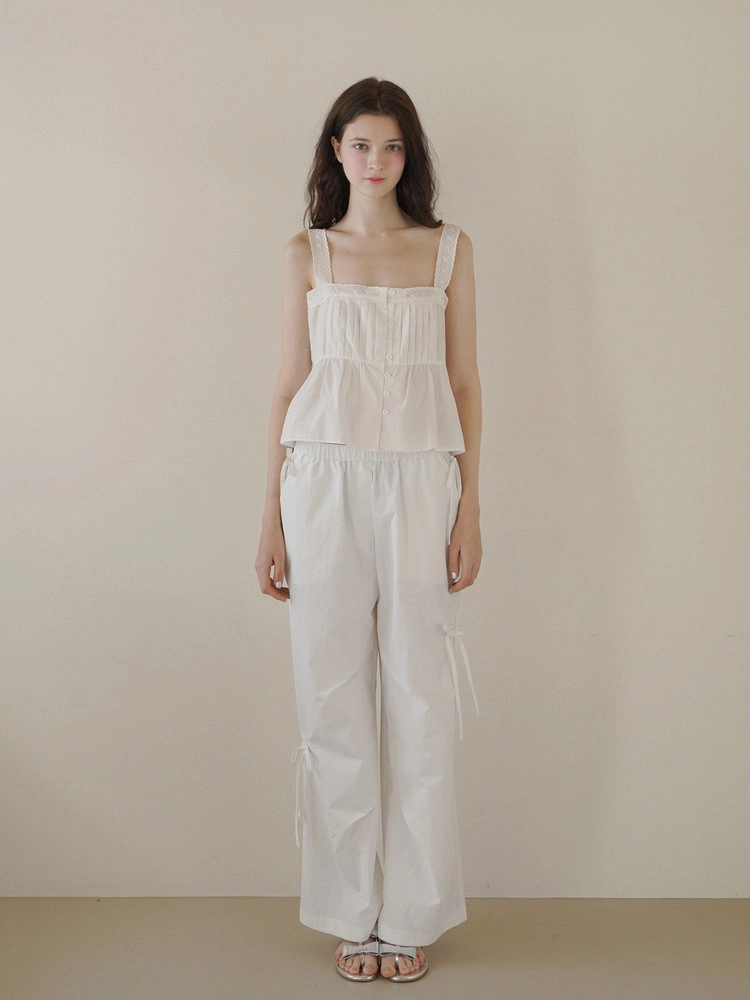 리본 스트링이 유니크한 포인트가 되는 와이드 팬츠입니다. 리본 스트링을 조여 자유롭게 핏을 조절할 수 있으며 안쪽에 네 개의 턱을 잡아 자연스럽게 흐르는 실루엣을 연출합니다. 루즈한 핏과 에어로 공정으로 가볍고 편안하며 은은한 트윌 조직이 매력적인 원단으로 착용감에서도 만족감을 드립니다. 비침이 거의 없으며, 일상의 다양한 환경에서 방수가 가능합니다. 리싸이클 나일론 원단으로 제작되어 환경에 대한 우리의 관심과 책임을 반영합니다.